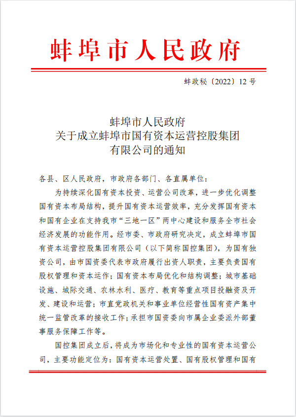 蚌埠市人民政府關(guān)于成立蚌埠市國有資本運(yùn)營控股集團(tuán)有限公司的通知
