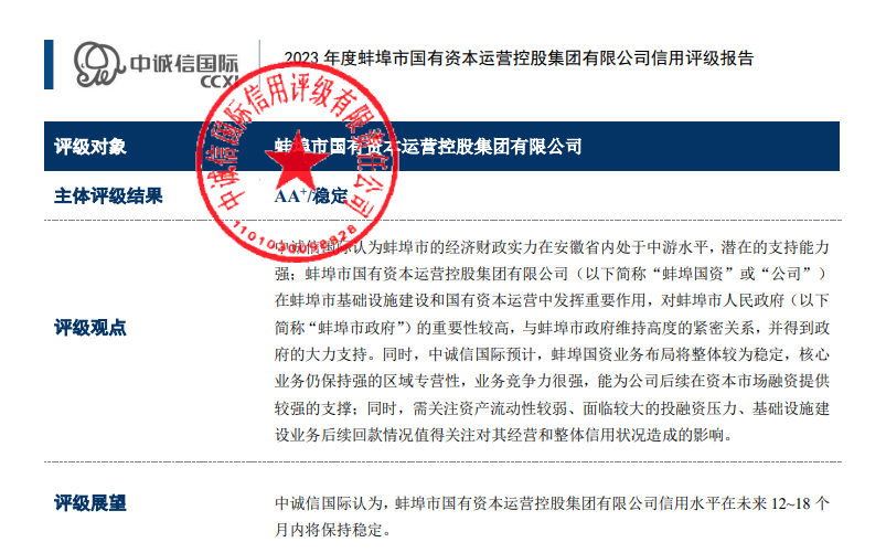 2023年9月4日,經(jīng)中誠信國際信用評級有限公司評定,蚌埠市國有資本運營控股集團有限公司再次成功獲評AA+主體信用評級,評級展望為穩(wěn)定,時效期為一年。這是蚌埠國控集團繼2022年8月5日獲得東方金誠國際信用評估有限公司評定的AA+主體信用評級后,再次評為AA+級信用主體,實現(xiàn)了AA+主體信用“雙評級”。